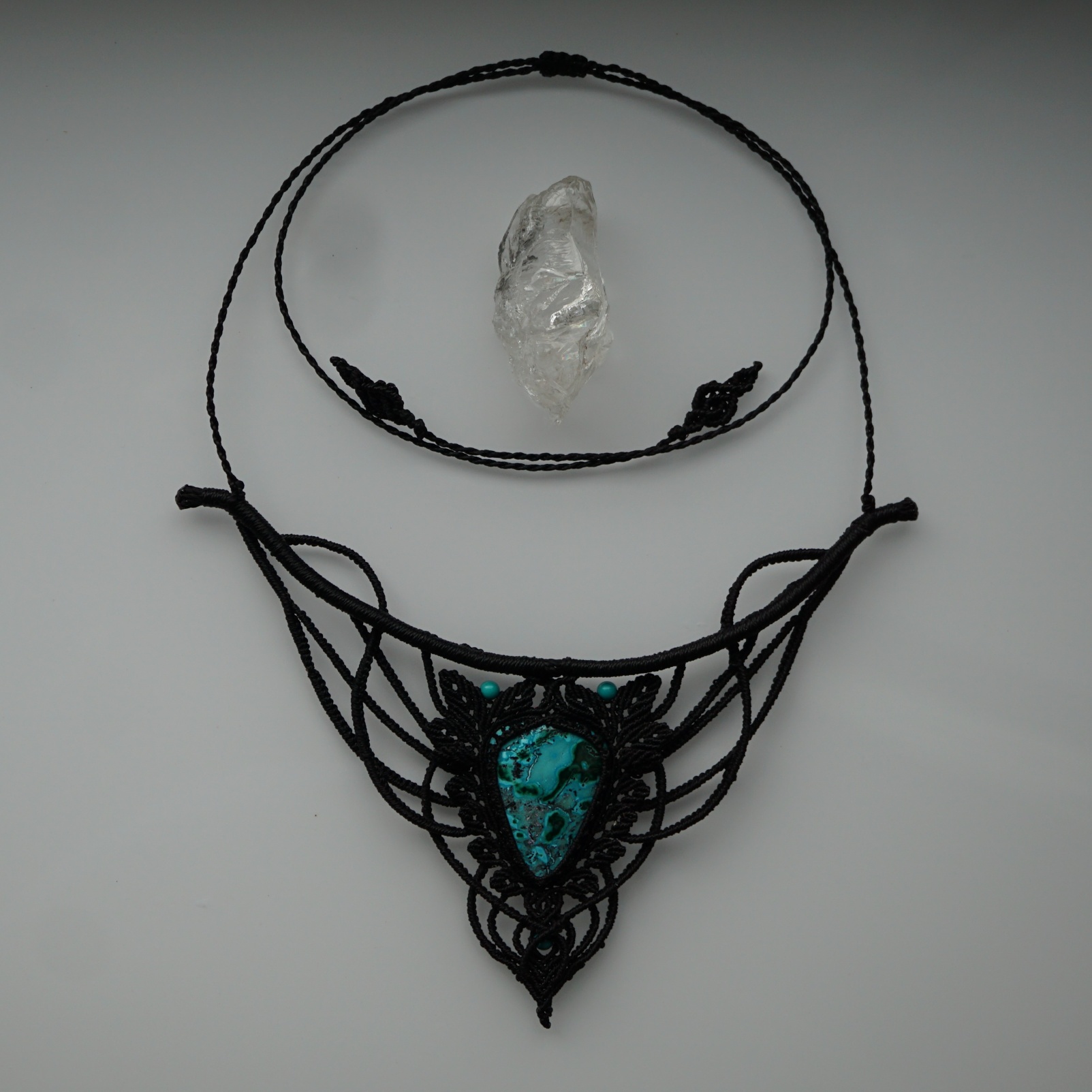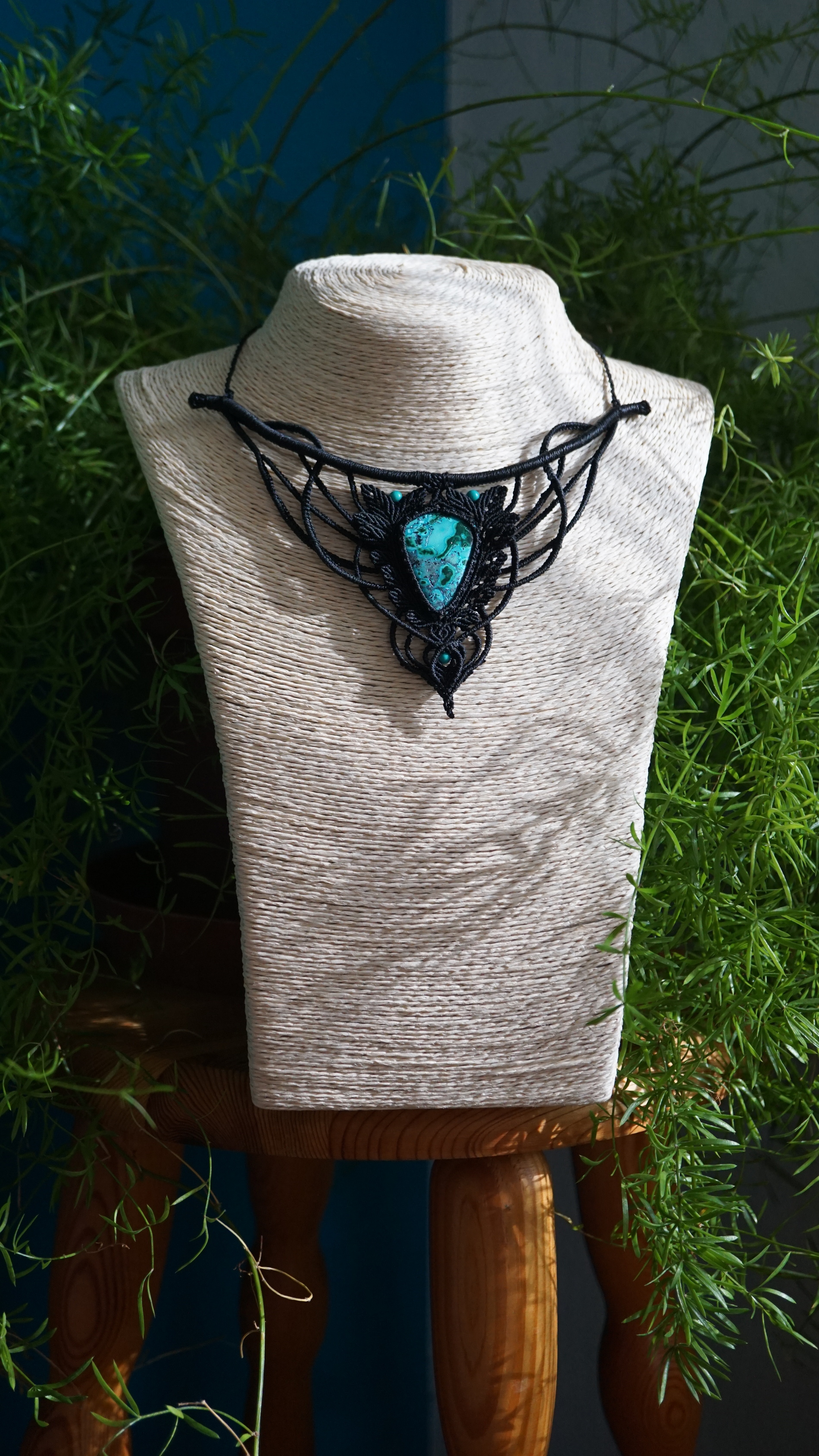 Náhrdelník s úžasně vybarveným vzácným kamenem chryzokol-malachitem, který v sobě nese poselství proměny, nových začátků, harmonie a celistvosti. Šperk jsem tvořila několik dní a dokončila v den jarní rovnodennosti. I v něm je obsažena rovno-váha. Ono ticho uprostřed tornáda. Ornamenty zdobící kámen mají symboliku Taura (znamení býka), který vnáší spojení se zemí (tolik potřebné uzemění.)