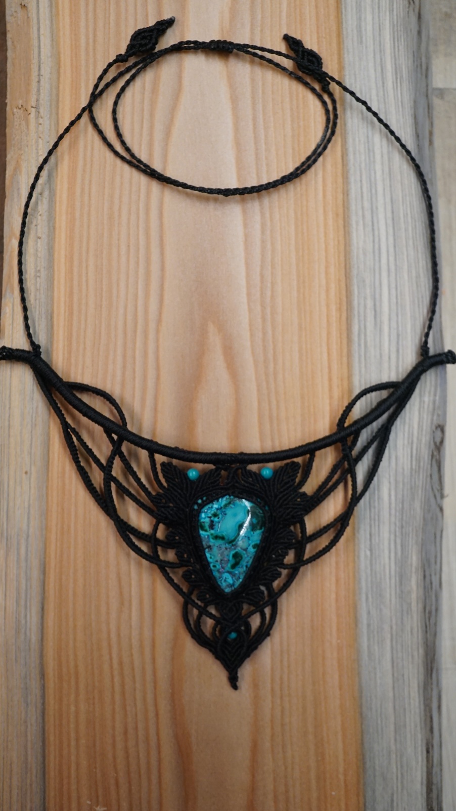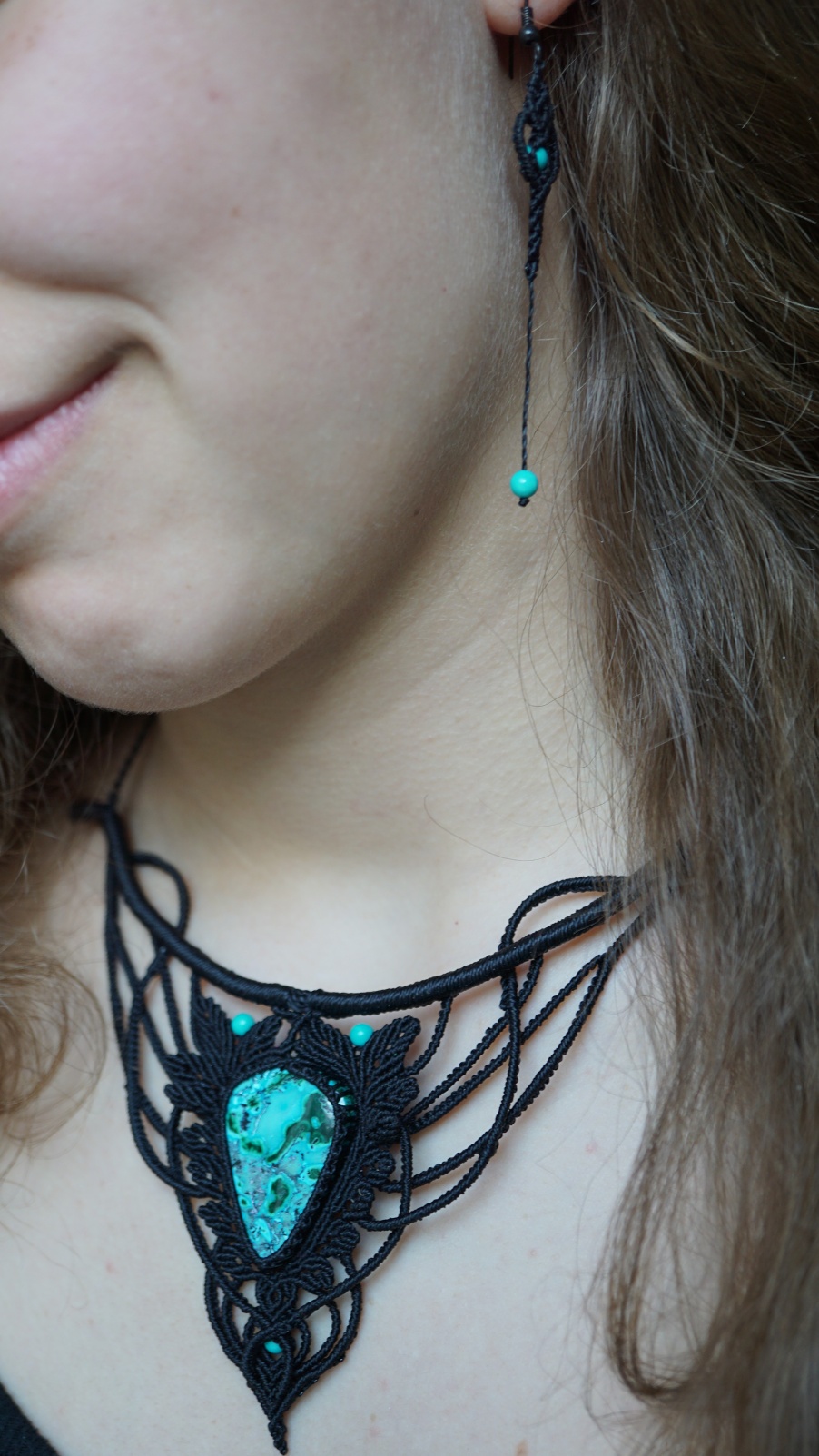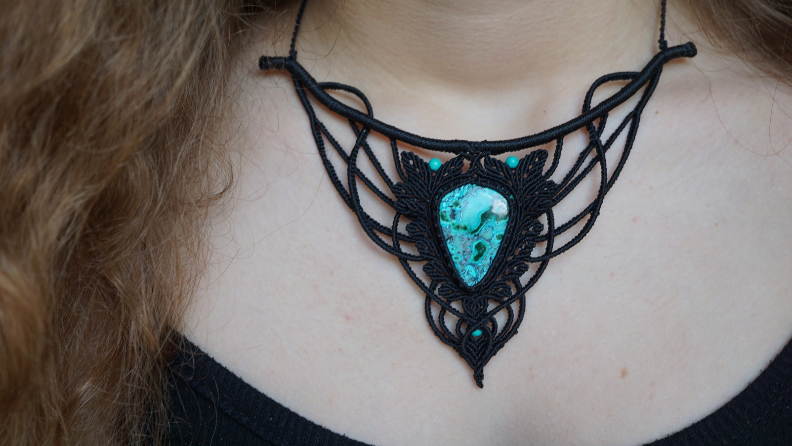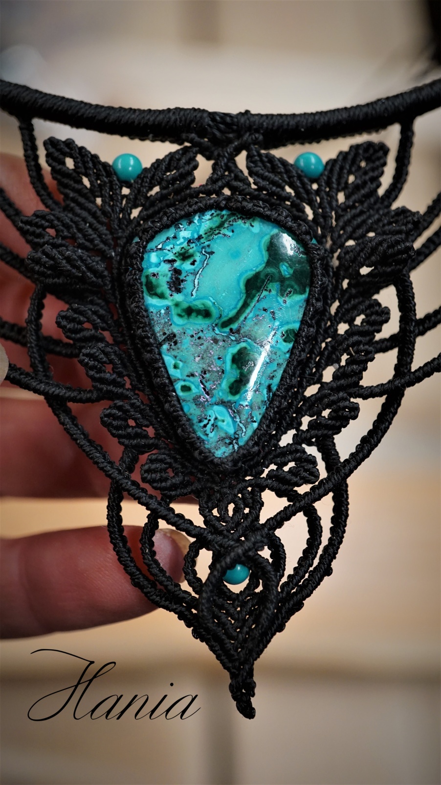 Náhrdelník je na utahování. Použila jsem extra jemné brazilské povoskované nitky černé barvy a síle 0,5 mm. Práce je velmi precizní a několikadenní. Korálky jsou z přírodního sinkingského tyrkysu, nitky jsou černé barvy.
