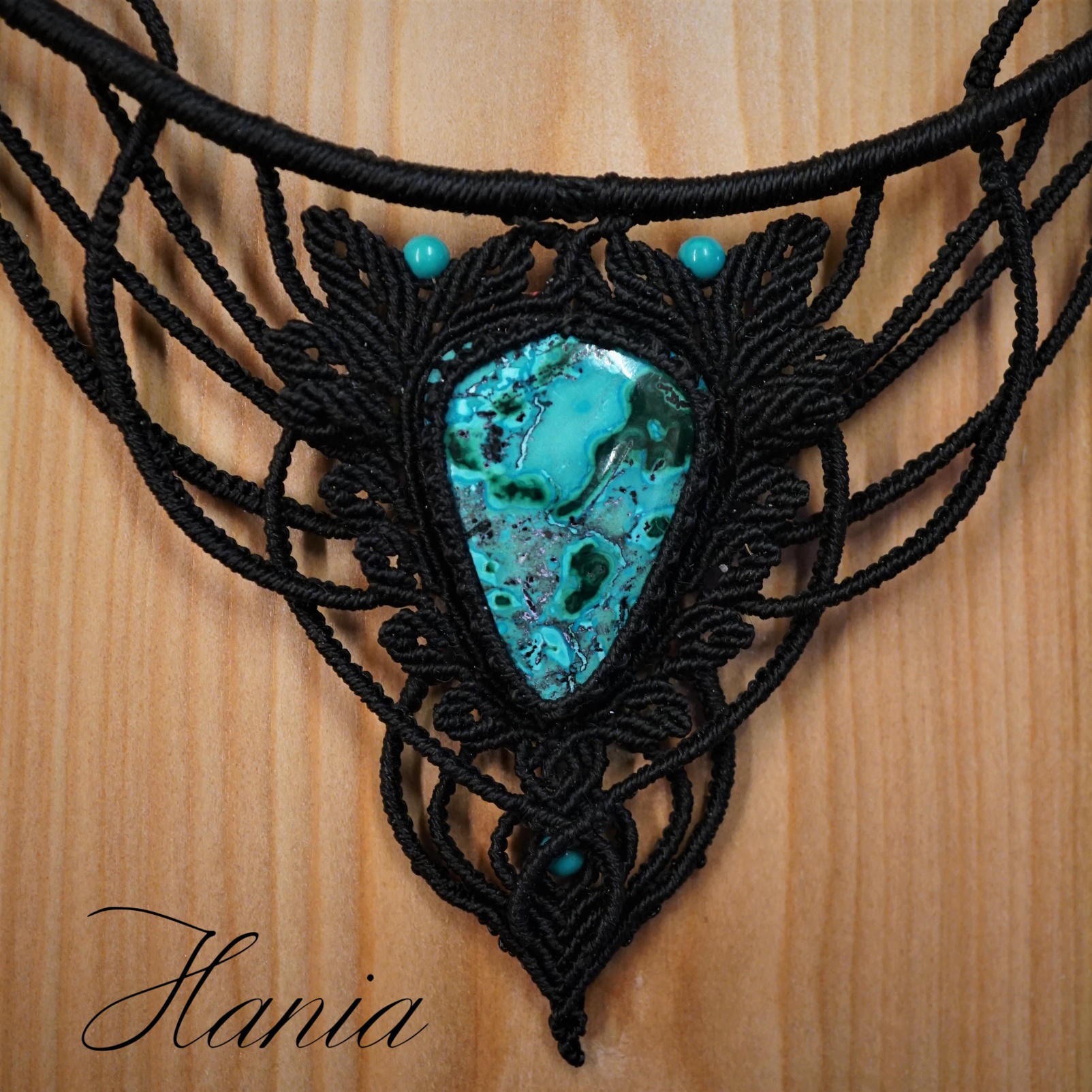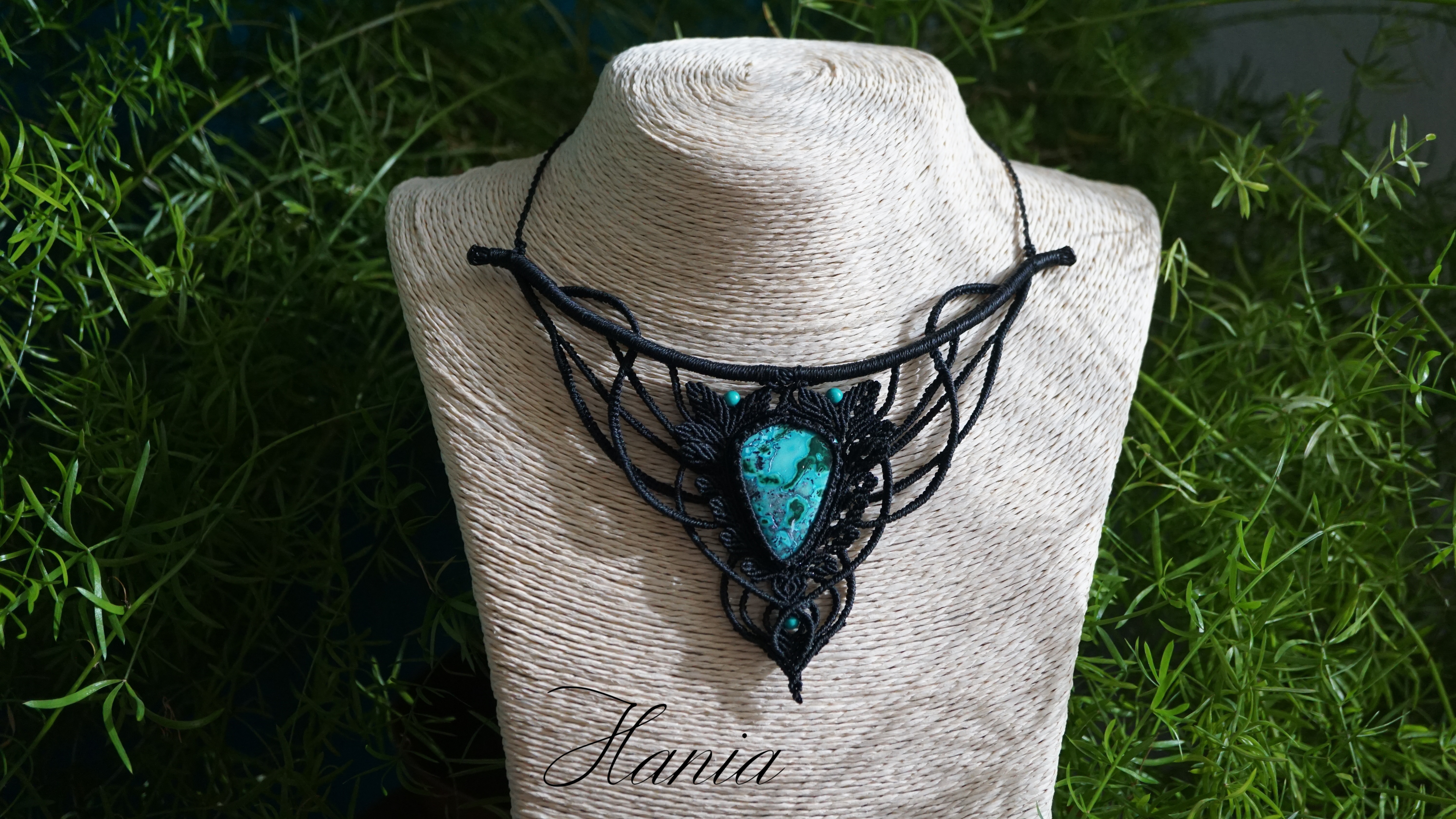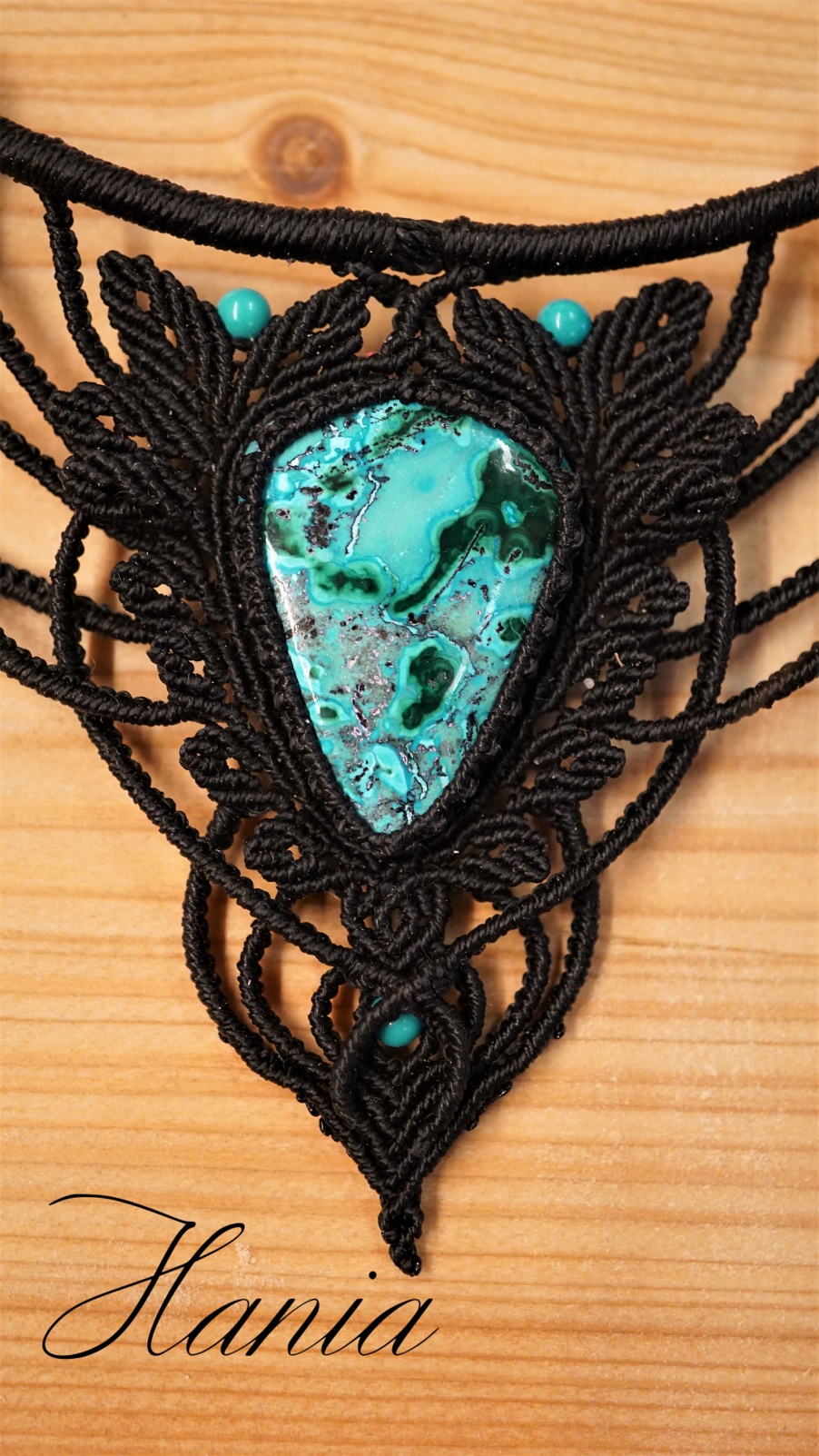 Náhrdelník je na utahování. Použila jsem extra jemné brazilské povoskované nitky černé barvy a síle 0,5 mm. Práce je velmi precizní a několikadenní. Korálky jsou z přírodního sinkingského tyrkysu, nitky jsou černé barvy.