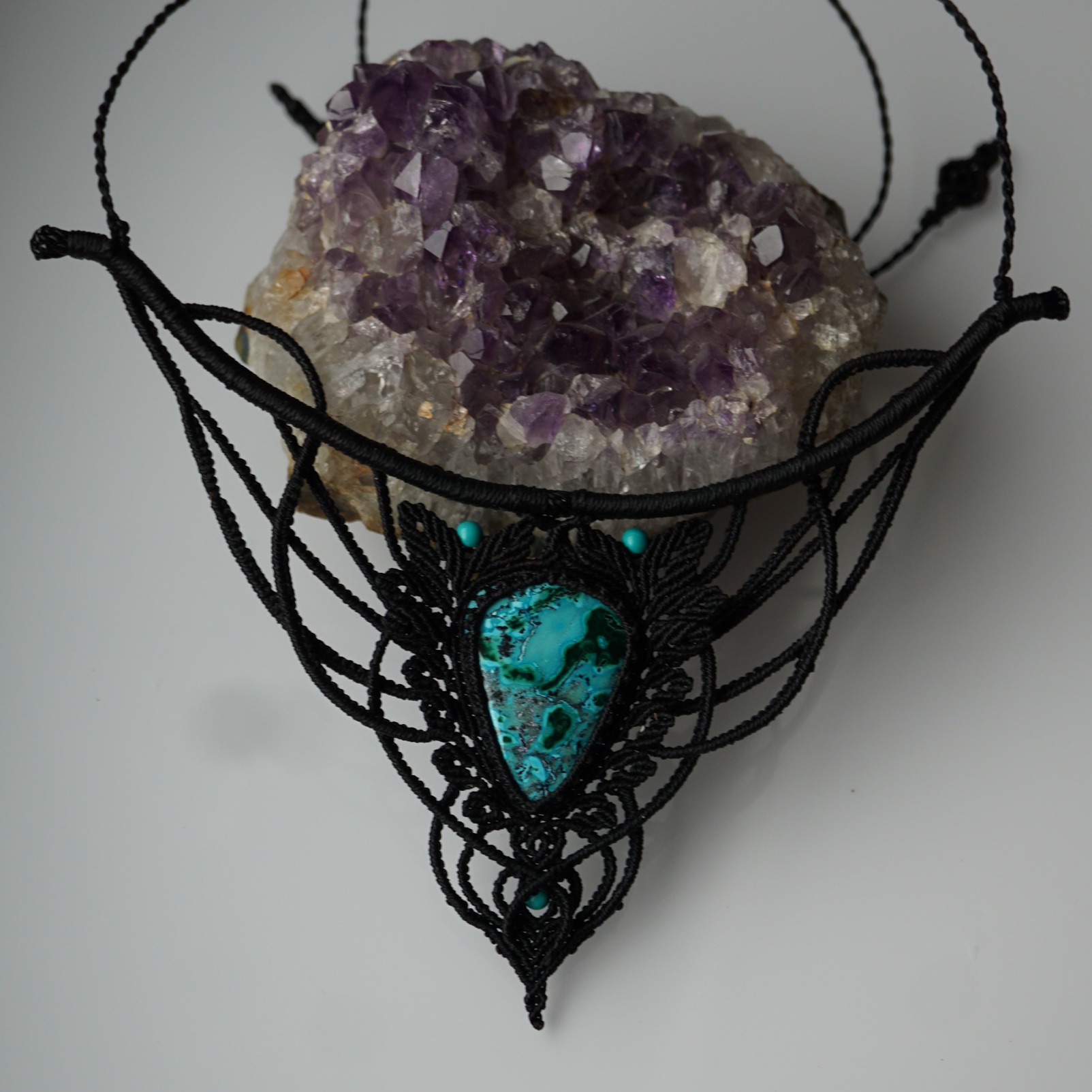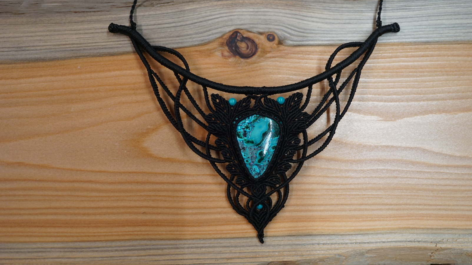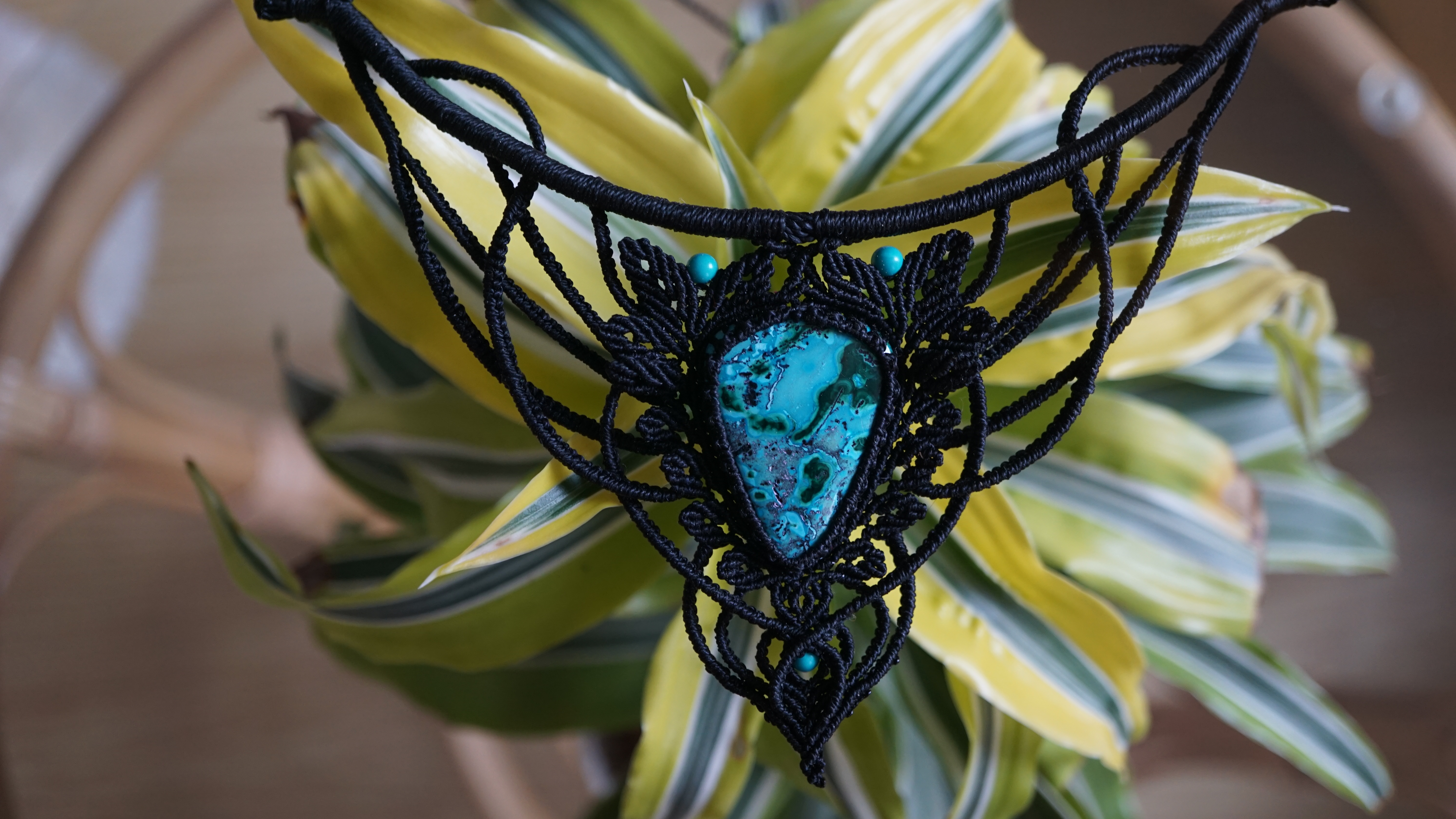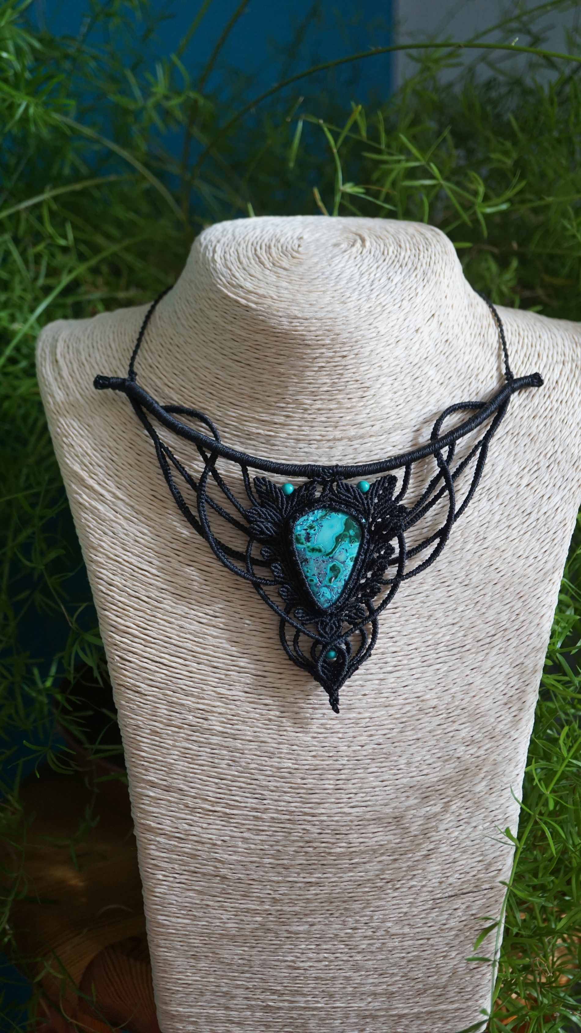 Náhrdelník je na utahování. Použila jsem extra jemné brazilské povoskované nitky černé barvy a síle 0,5 mm. Práce je velmi precizní a několikadenní. Korálky jsou z přírodního sinkingského tyrkysu, nitky jsou černé barvy.