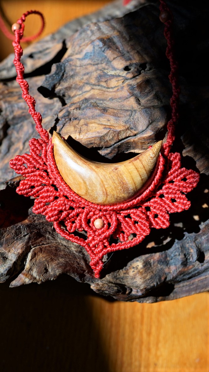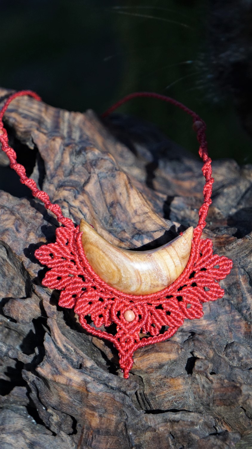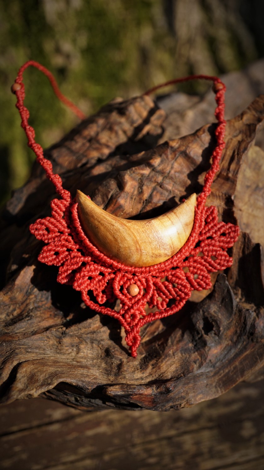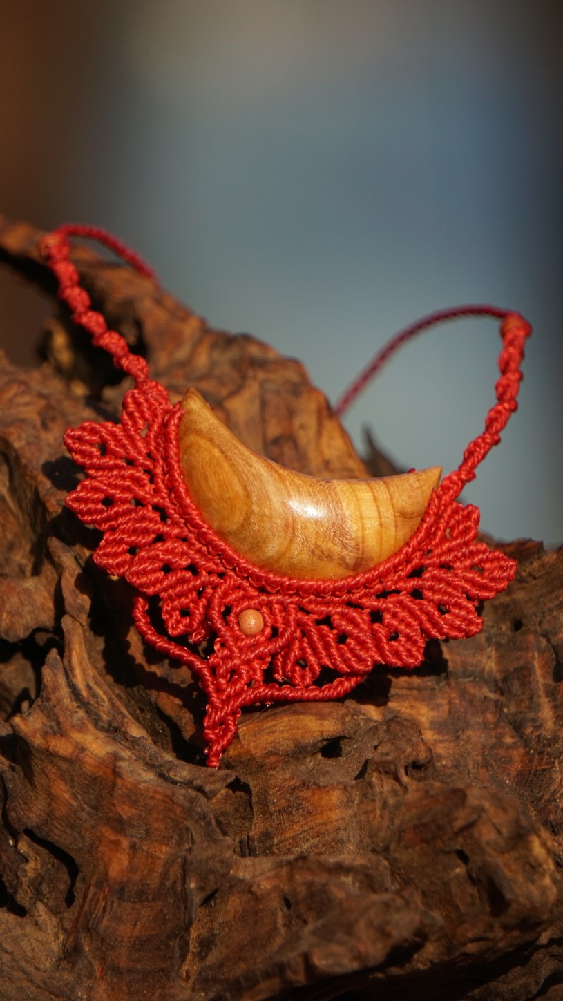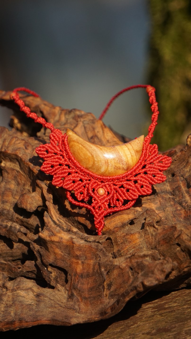 Šperk vznikl technikou micro macramé, což uzlíkování pouze za pomoci šikovných prstů a fantasie. Používám brazilské povoskované nitky, které jsou jedny z nejkvalitnějších na světě pro svou pevnost a stálobarevnost. Barva nitek je červená. Délka závěsu je nastavitelná podle potřeby až po solar plexus.