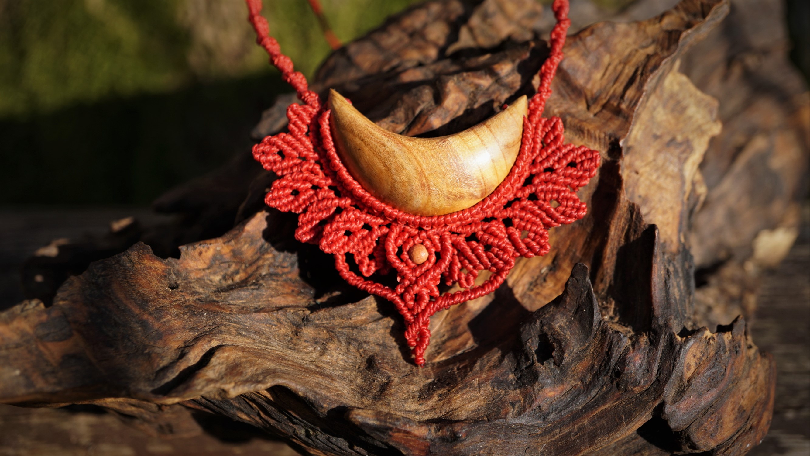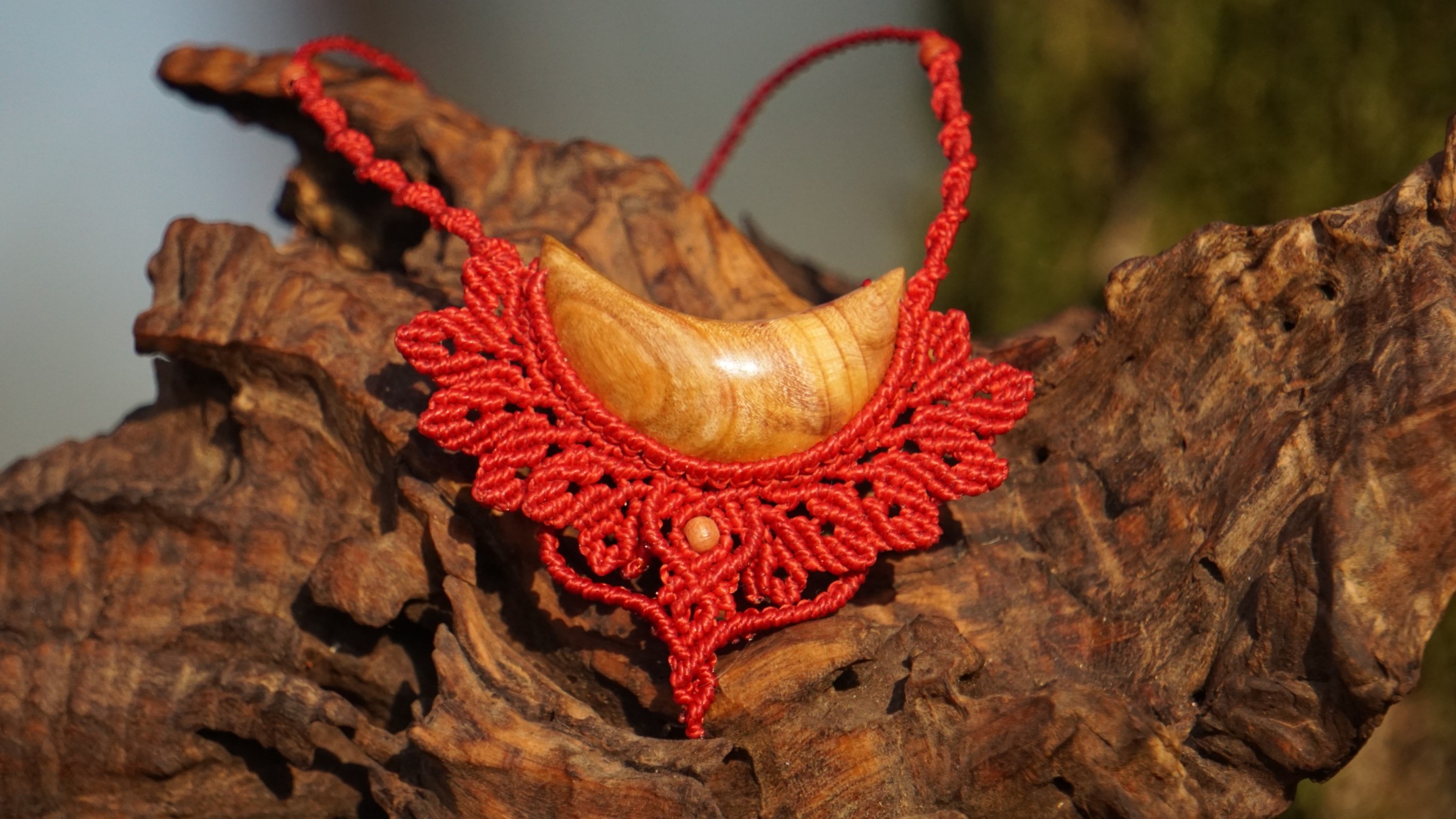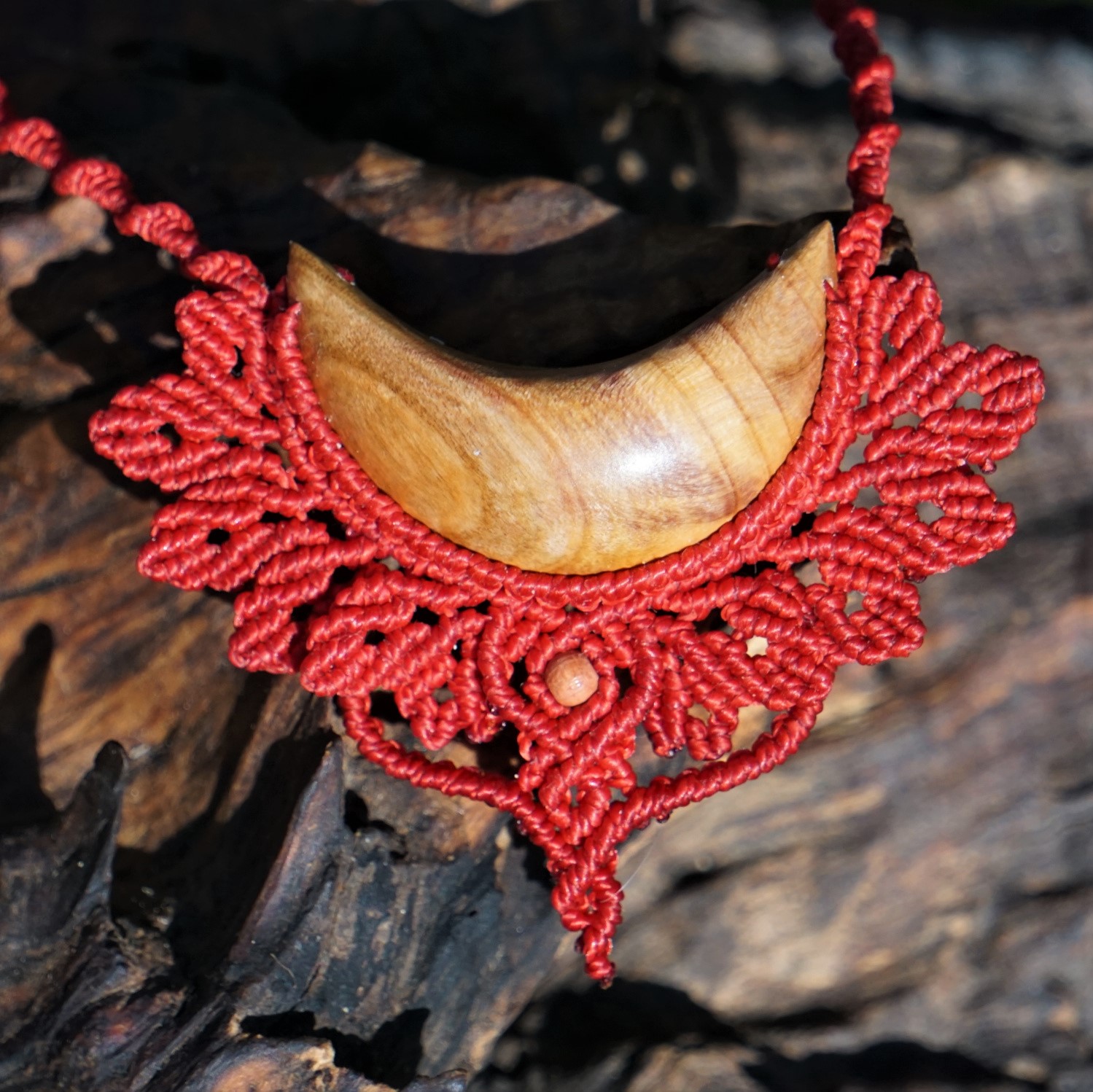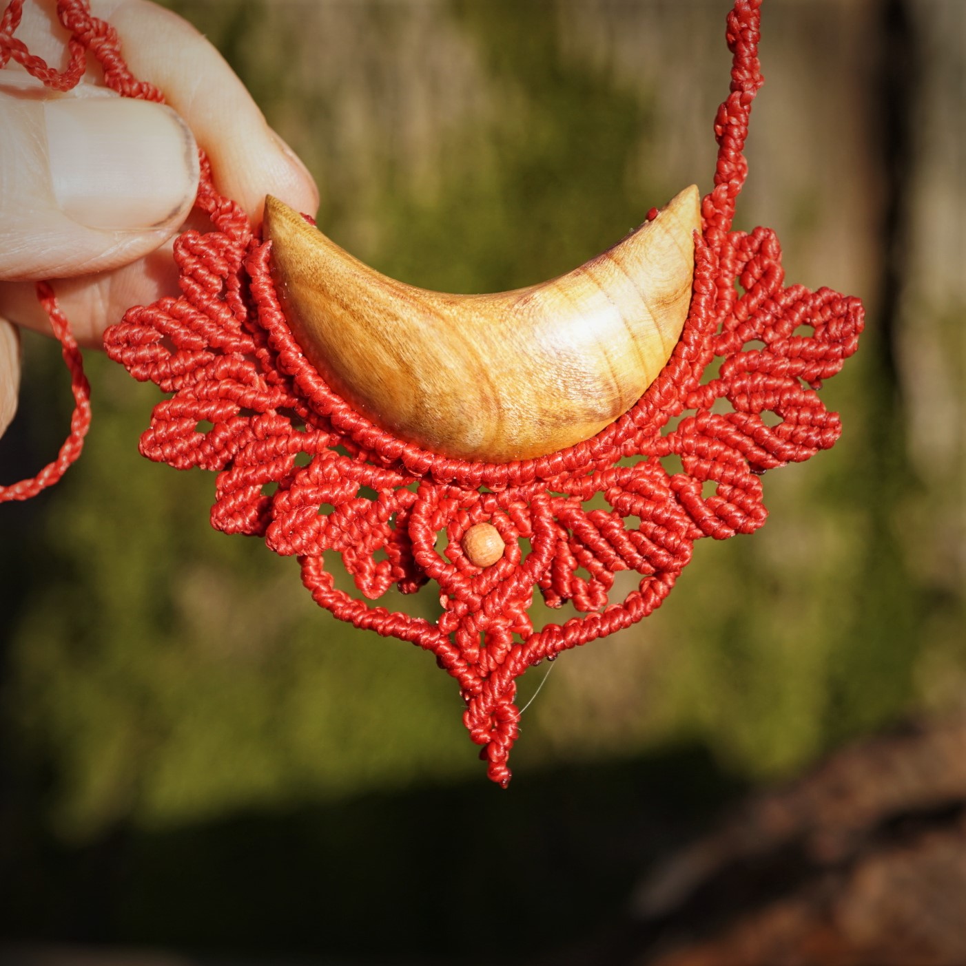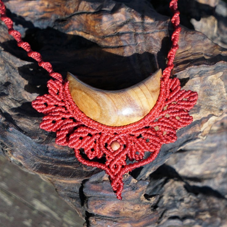 Šperk vznikl technikou micro macramé, což uzlíkování pouze za pomoci šikovných prstů a fantasie. Používám brazilské povoskované nitky, které jsou jedny z nejkvalitnějších na světě pro svou pevnost a stálobarevnost. Barva nitek je červená. Délka závěsu je nastavitelná podle potřeby až po solar plexus.