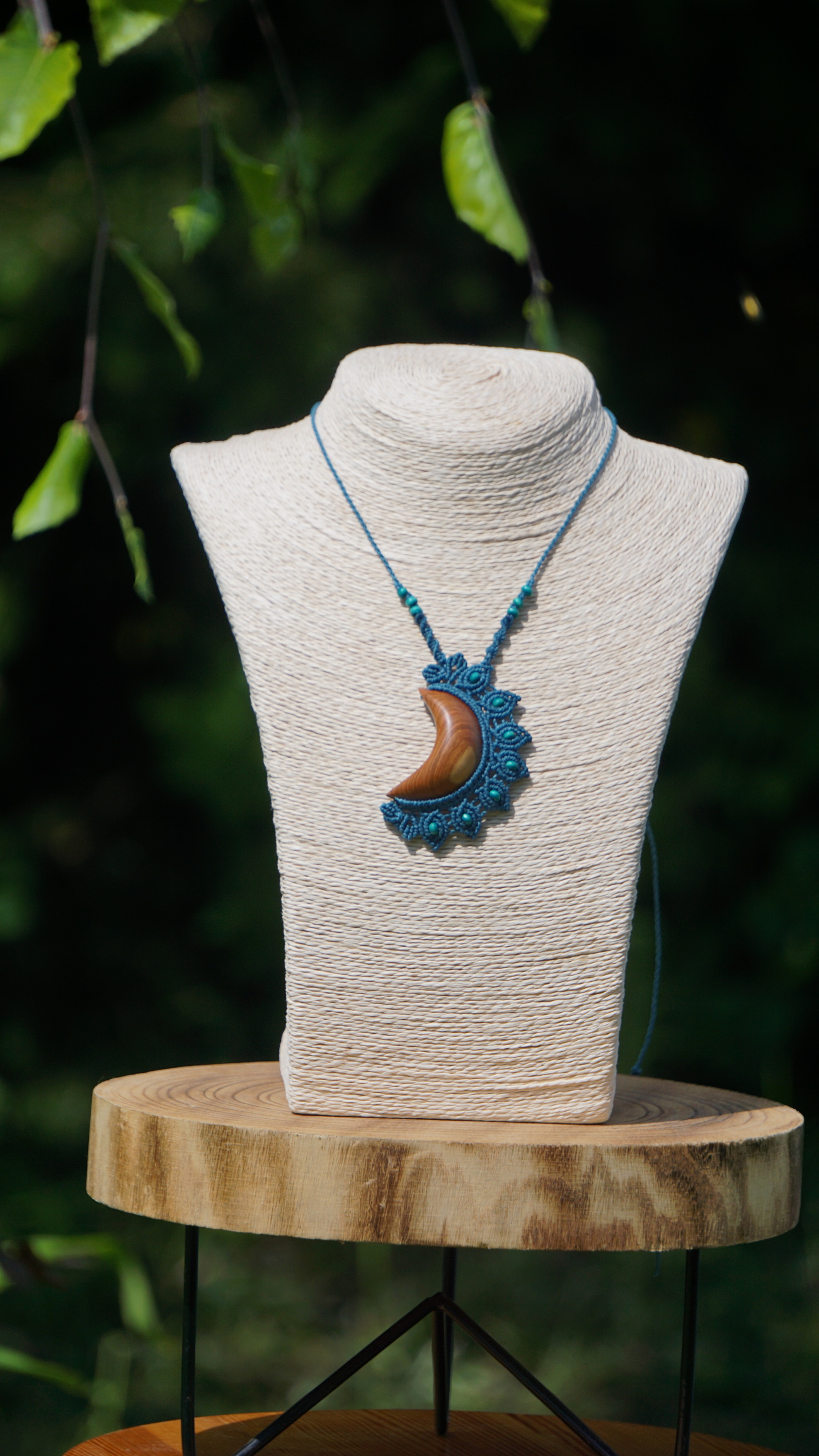 Barva šňůrek tmavě tyrkysové barvy, doplněno dřevěnými korálky.