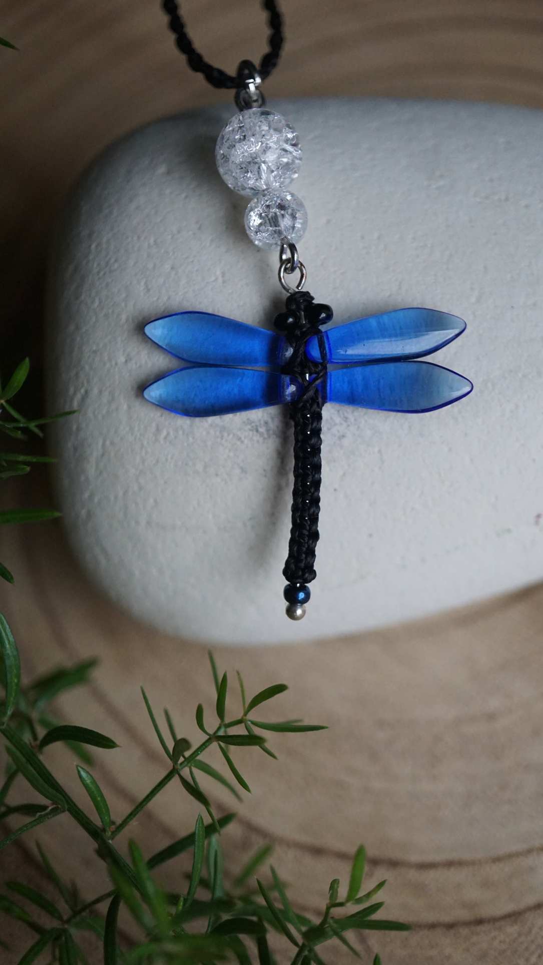 Křidélka vážky jsou skleněná, barva nitek černá, korálky z křišťálu, technika se jmenuje micro macramé (vázání uzlů, drhání).