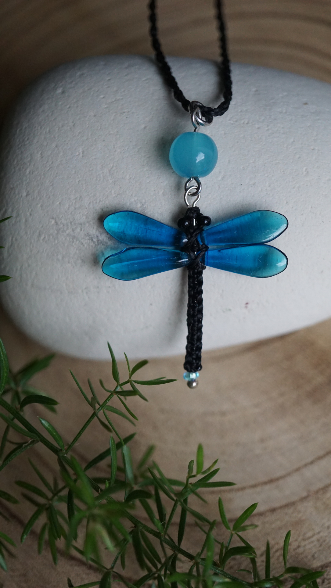 Křidélka vážky jsou skleněná, barva nitek černá, korálky aqua chalcedon, technika se jmenuje micro macramé (vázání uzlů, drhání).