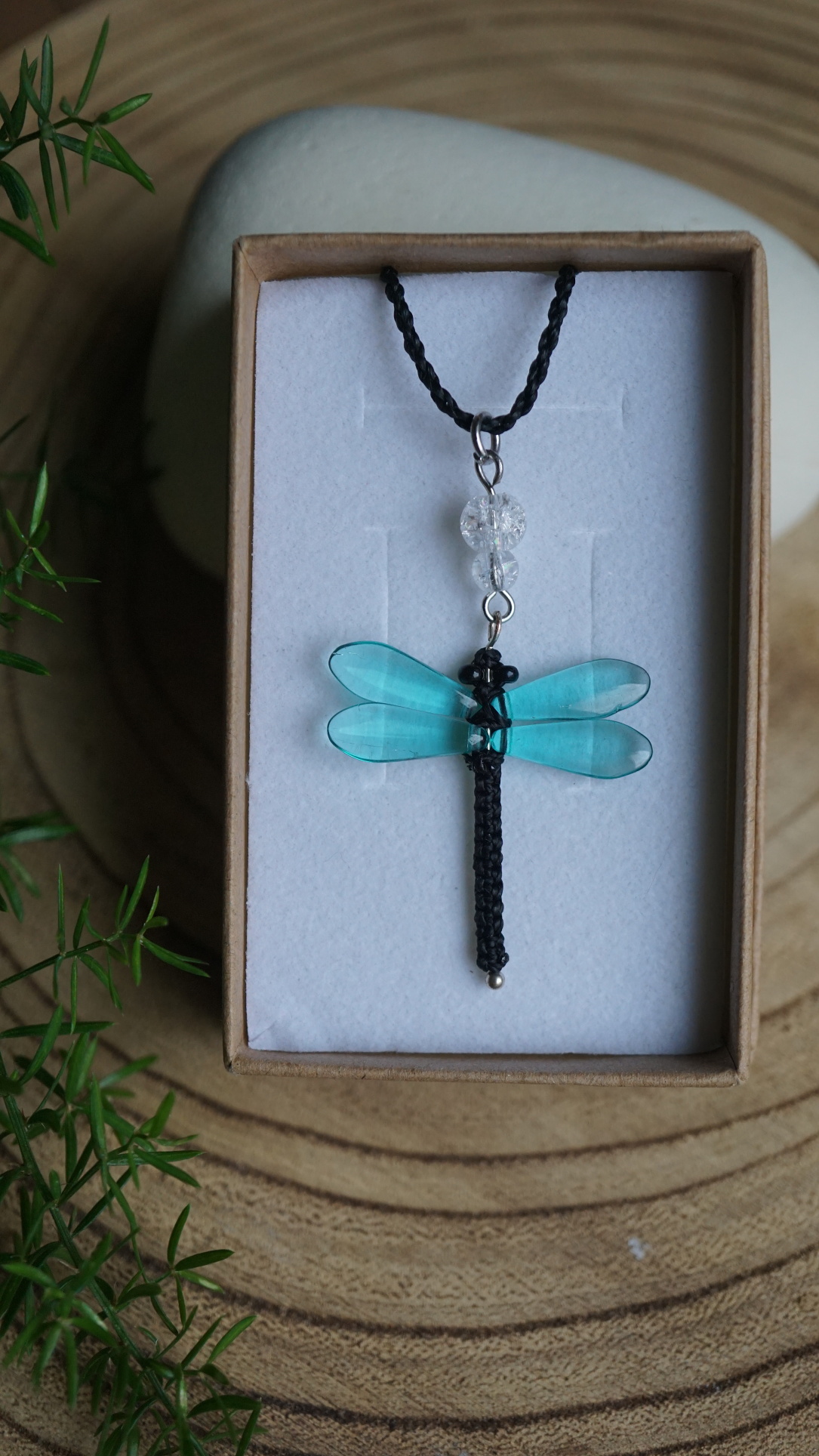 Křidélka vážky jsou skleněná, barva nitek černá, technika se jmenuje micro macramé (vázání uzlů, drhání).