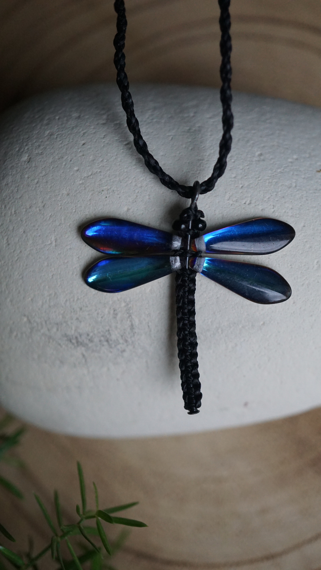 Křidélka vážky jsou skleněná, barva nitek černá, technika se jmenuje micro macramé (vázání uzlů, drhání).