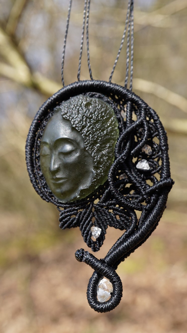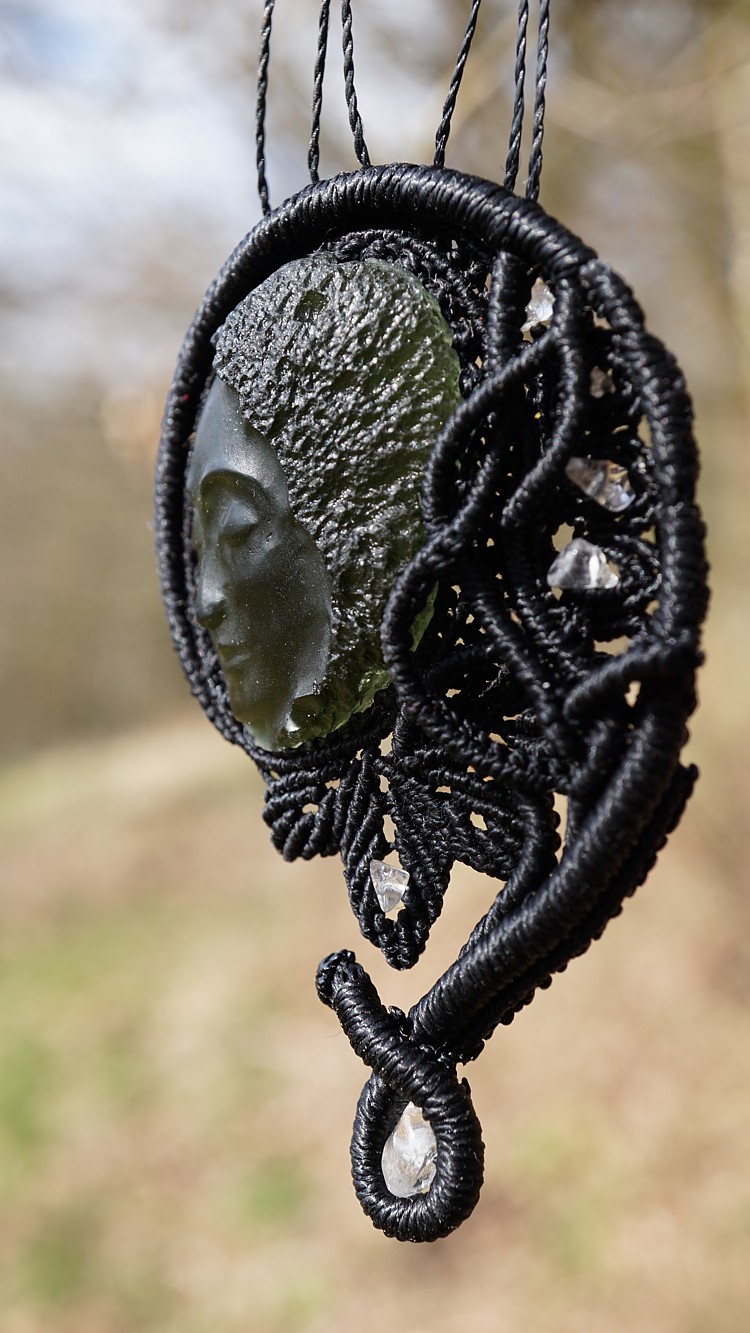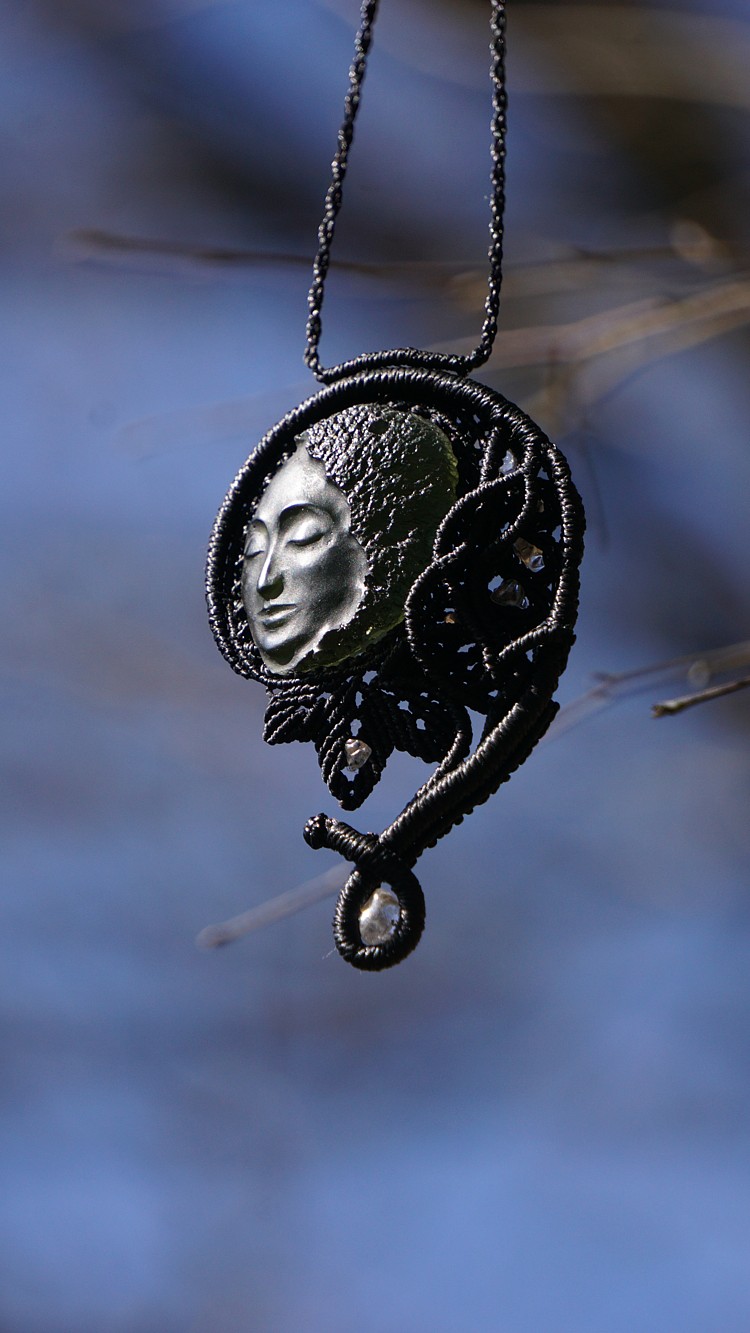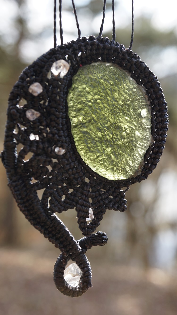 Umělecky vybroušený vltavín z dílny Pavlíny Čambalové, upevněný brazilskými povoskovanými šňůrkami ve velmi jemném provedení technikou micro macramé (vázání uzlů), doplněný křišťálky.