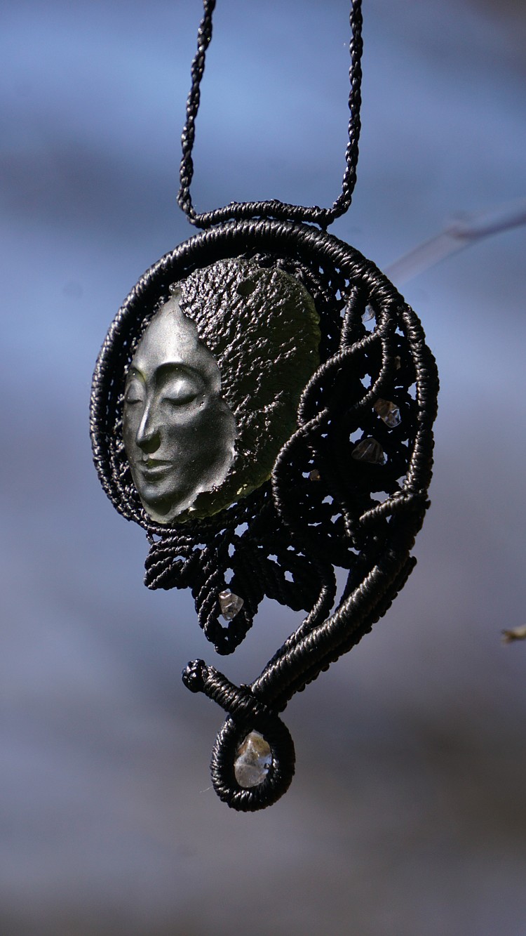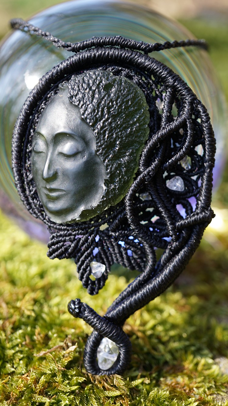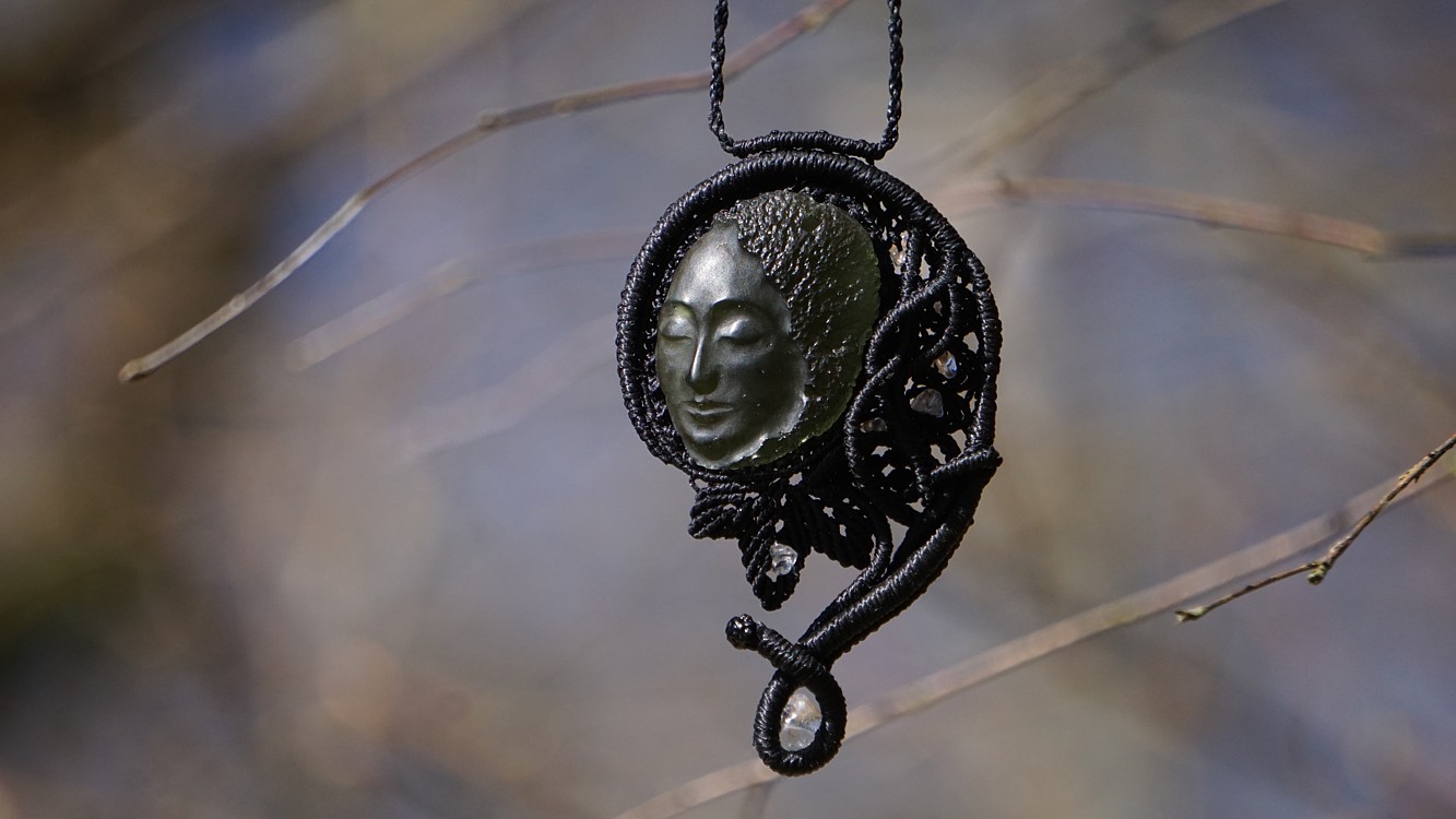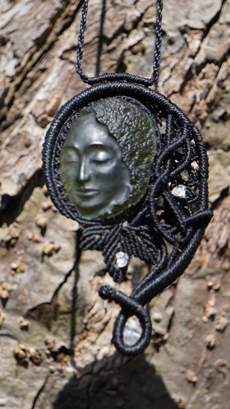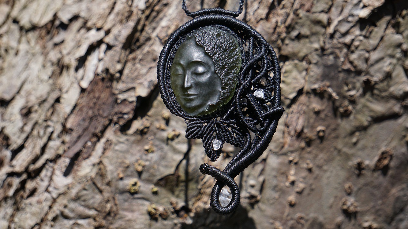 Umělecky vybroušený vltavín z dílny Pavlíny Čambalové, upevněný brazilskými povoskovanými šňůrkami ve velmi jemném provedení technikou micro macramé (vázání uzlů), doplněný křišťálky.