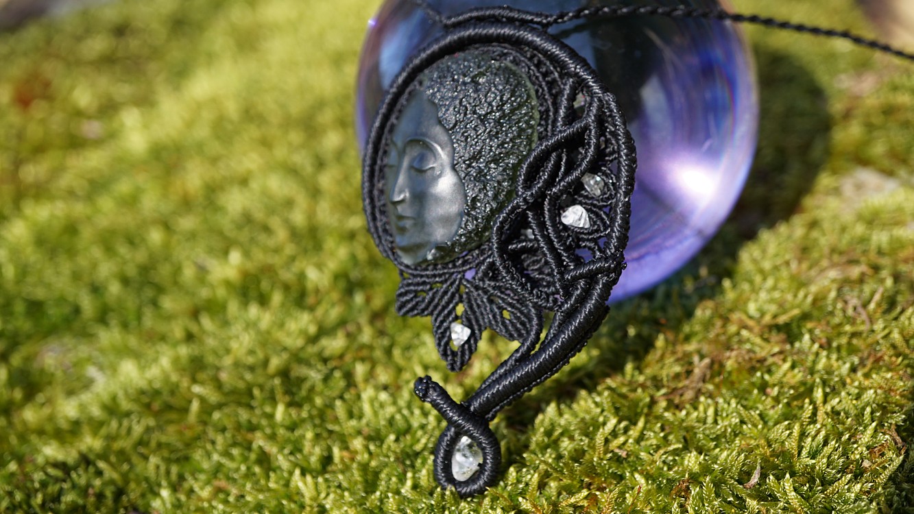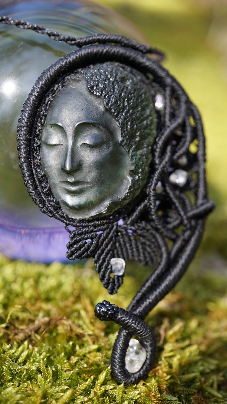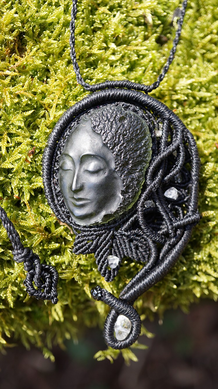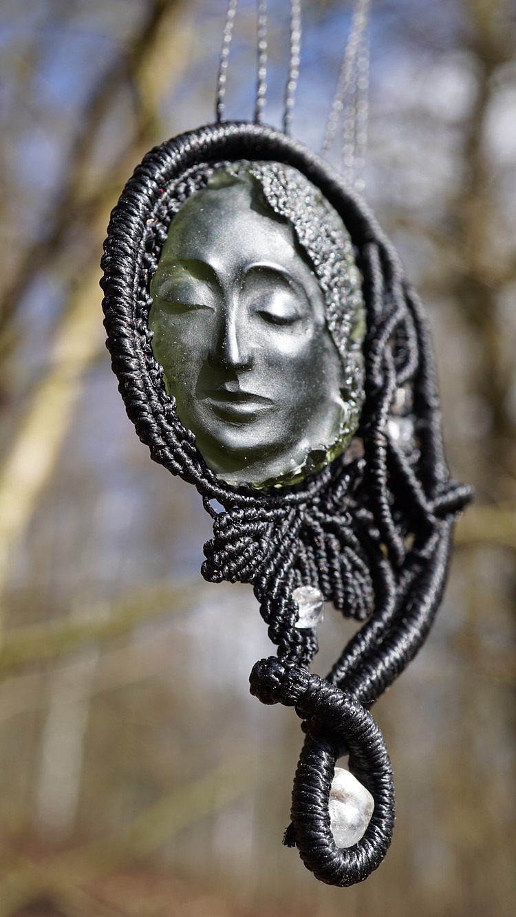 Umělecky vybroušený vltavín z dílny Pavlíny Čambalové, upevněný brazilskými povoskovanými šňůrkami ve velmi jemném provedení technikou micro macramé (vázání uzlů), doplněný křišťálky.