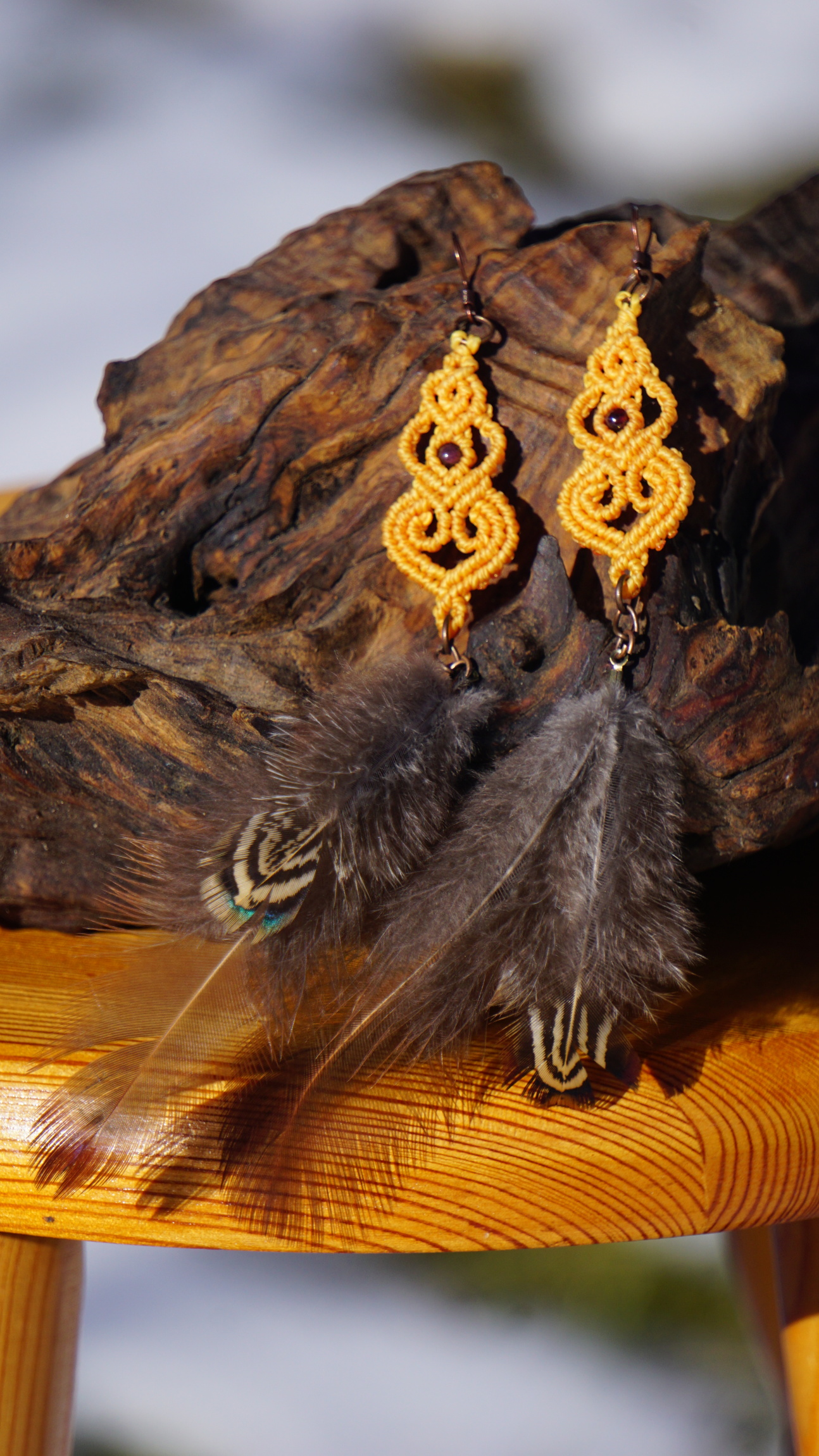 Barva nitek je sluníčkově žlutá (teplý odstín). Minerální korálky jsou z granátů, pírka koroptví.